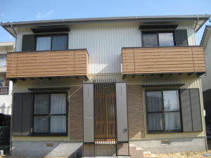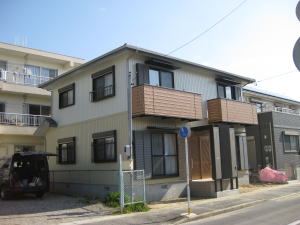 外壁は2色使いの鋼板張り、寄棟屋根はイブシ平板瓦ぶき、バルコニーはアルミ製の持ち出し型を採用。