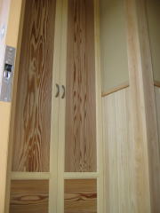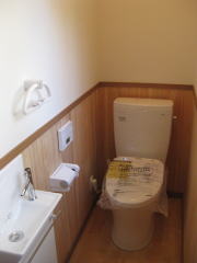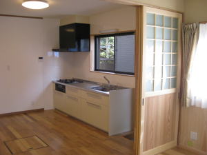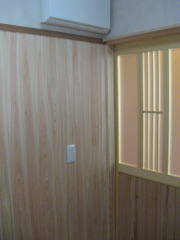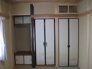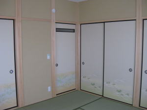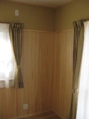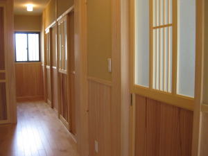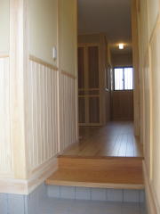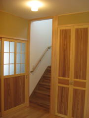 | 内装概要 | 玄関ポーチ部の外壁のみレンガ調タイルを貼って重厚感を演出し、道路からの距離が近いので目隠しを兼ねてエントランスポーチ(屋根付き)を施工しました。 玄関ホールの奥、家の中心に大黒柱『東濃桧(ヒノキ)の通し柱(トオシバシラ)24p角』が立って建物全体の荷重をしっかりと支えています。 通し柱とは1階〜2階を貫いている柱の事で、この大黒柱は基礎から小屋組(こやぐみ…2階の屋根の骨組)まで貫いており、地震で横揺れが長く続いた時に「1階部分と2階部分が時間差で別々に揺れ動く」のを防ぐ役割を果たします。 床の間・仏間・神棚のある和室、真壁(しんかべ…柱が室内あらわしになる壁)・竿天(さおてん…竿縁天井)・長押(なげし…鴨居上に付く装飾板)という定番造りの和室の室内仕上です。 床柱(トコバシラ…床の間の飾り柱)は当社おなじみ、槐(エンジュ…中心と端っこの色が大きく異なる銘木)を使いました。 システムキッチンは一般的な『 I 型』、DK(ダイニングキッチン…食堂と台所が一体となった部屋)のDとKの動線(人の通る経路)を一体化できるので省スペースとなり、室内を広く使う事ができます。 右下は2階の洋室、壁の東濃桧の無節板が発する優しい香りでグッスリ安眠できる部屋です。 |