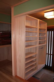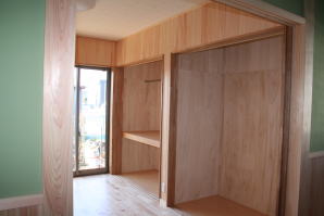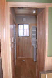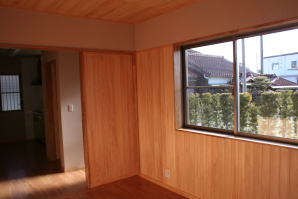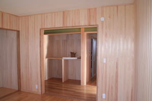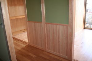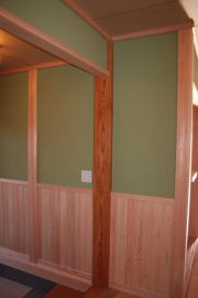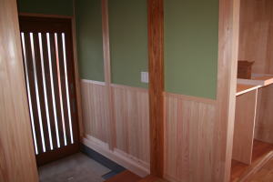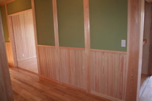 | 内装概要 | 玄関まわりの外壁はポーチ柱がアラワシ仕上となっており、この部分の外壁面には東濃桧の無節板を取り付け、外装木材用の保護塗料で塗装仕上をおこなっています。 真壁(しんかべ…柱あらわしとなる形状の壁)の多い内装仕上のお住いです。 玄関ホールには当社おなじみケヤキ材、「ケヤキ子大黒柱150角」が鎮座しています。 ケヤキならではの趣深い杢目で重厚な存在感を放っており、玄関とホールをぐっと格調高い空間に演出しています。 ちなみにこのK様邸は『総桧造り』の軸組(家の骨組)となっており、この子大黒柱を除いた全ての軸組に桧材が使われています。 洋室の壁面は天井まで、トイレは床面から約2mの高さまで東濃桧の無節板を使った壁仕上としました。(真壁に対して、これらの壁の様に「柱が壁の中に隠れて室内から見えない形状の壁」を大壁(おおかべ)と呼びます。) |