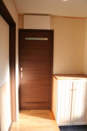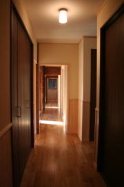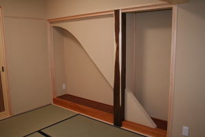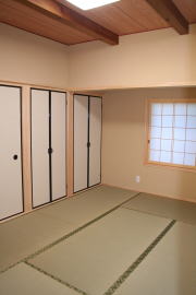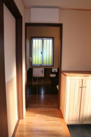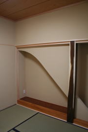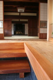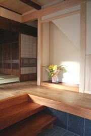 | 内装概要 | 主玄関の腰壁には石目調ボーダー(細目状)タイルを施工しました。 目地を付けながら施工する為に時間と費用がかかりますが、重厚な雰囲気で玄関空間を格調高く演出する外壁仕上です。 主玄関は式台(小縁板)の下に踏み台を設けて上り下りを楽にしており、小屋裏への階段下スペースを活かして飾り床をつくって玄関空間を華やかに演出しています。 玄関を入って左手の「2間つづきの和室、一段上がって仏間」をそのまま残して、他の部分は全て解体して構造補強をおこない、基礎を新設して間仕切り壁を造って間取りを変更しました。 この和室の板戸や障子の上部、柱と柱の間に差し込まれた鴨居(カモイ)は梁(ハリ…家の上階の床を支える横架材)の様に太く、現代の木造住宅の筋違(スジカイ…柱と柱の間に斜めに立ち、地震の横揺れの際に耐力を発揮する部材)と同じ役割を果たします。 筋違という部材はここ最近の数十年で出てきた物であり、それよりも前の時代に建てられた家にはこの「鴨居造り」が耐震の役に立っていました。 たとえ築60年を超える建物でも直下の地盤がしっかりしていて、鴨居造り等の頑強な構造が傷んでいなければ、地震によって簡単に倒壊することはありません。 ちなみに北の和室にある床の間の写真、斜めに盛り上がっている壁の内部には以前の耐震補強工事で施された構造補強材(鉄骨の筋違)が入っています。 |
