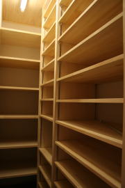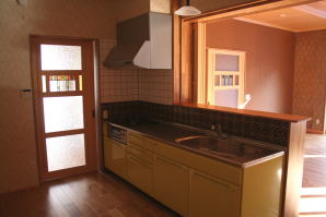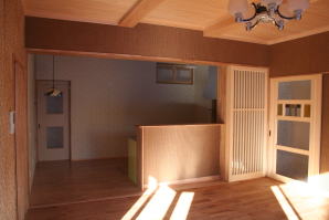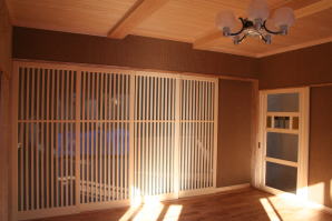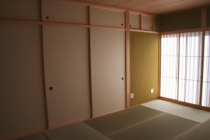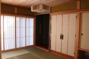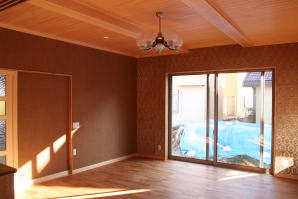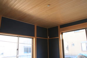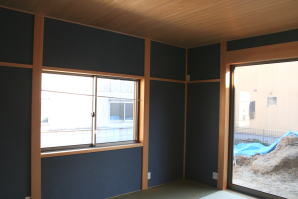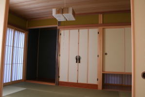 | 内装概要 | 家の中央南側には「梁あらわし天井のリビング」があります。 化粧(けしょう…きれいに室内仕上として見せる材)あらわしとなる梁(はり…建物の水平方向の軸組)には東濃桧の無節の極太材を使っており、同じ材である東濃桧の無節板を梁と梁の間に張って天井仕上としました。 レンガ調の外壁と南欧風S型瓦葺きという洋風な外観のお住いなのですが、家の内部については畳敷きの部屋が5部屋(その内、和室は4部屋)と多いです。 家の南西に「最も格式の高い和室」と隣接して「予備室として使う和室」、南面の真ん中にある「寝室として使う和室」、南東には壁面が青色の「客間や居室として使う和室」があります。 最も格式の高い和室には「床の間・仏間・下部に地窓を設けた押入」があって「長押(なげし…鴨居の上の装飾)」等の定番の和室仕上となっており、この和室に隣接する部屋(東側と北側)も同じく和室という「3間つづきの和室」となっています。 一方で隣接している和室2部屋には、それぞれ幅2.7mで奥行90pの収納を設けて、大きな収納力を確保して「居室」としての使い勝手を良くしています。 |