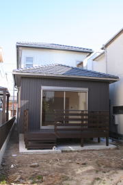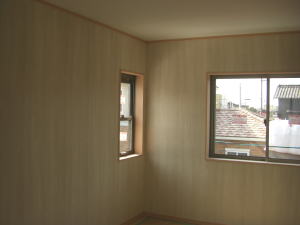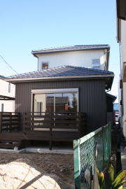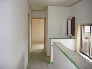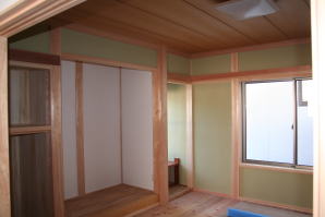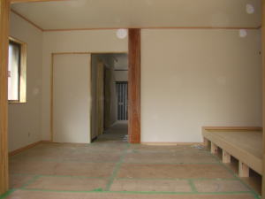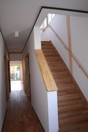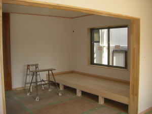 | 内装概要 | 完成前に段階的にお施主様の荷物の運び込みをおこなった為、間仕切戸や収納扉などの建具を組み入れる前の状態の写真を使っています。 廊下・階段は幅1m以上として空間に余裕を持たせ、日々の往来でストレスを感じさせないようにしました。 和室は床の間(窓付)・仏間・神棚のある定番造りですが、寝室としても使用するので、反対の壁面に畳2畳分の押入を設けて収納を確保しています。 リビングとDKの2部屋の床面にはヒートポンプ温水式の床暖房パネルが組み込んであります。 水をヒートポンプで圧縮して温水にしてチューブを通して床を温める構造、発熱しているのが温水なので保温性が良く、電熱式床暖房よりもランニングコストが安く済みますが、初期費用(床暖房機器の総額)は電熱式の物よりも少々高くなります。 冷気(冷たくなった空気)の溜まりがちな床面を床暖房が温めるので、効率よく快適な体感温度の空間を作ることができます。 このDKの大開口サッシ前に、物干スペースとしてデッキテラスを施工しています。 |