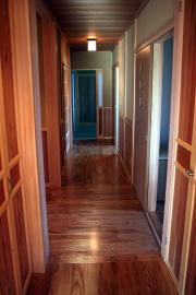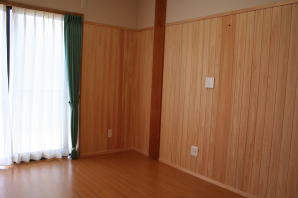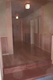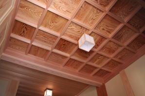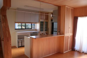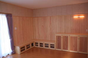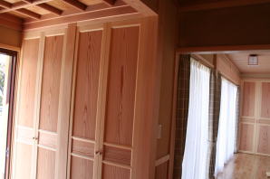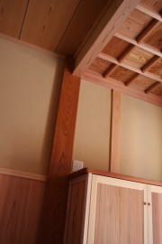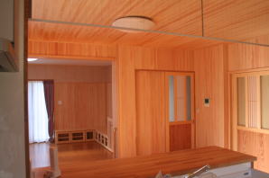 | 内装概要 | 玄関は合天(ゴウテン…格子天井)で格調高く仕上げ、ホールと広縁は目透し天井(継ぎ目にミゾを設けた形の幅広の天井)で落ち着いた和風のエントランス空間になっています。 リビングの床〜約2mまでの壁面は東濃桧の無節板張り仕上とし、その上部の壁面はLIXIL製エコカラット(湿気を吸ったりはいたり、調湿機能を持つ室内用タイル)を施工しました。 リビングに隣接してDKがあり、これらの部屋には温水式の床暖房を設けています。 冷たい空気がたまりやすい床面から床暖房が部屋全体を温めてくれるので、室内を効率良く快適な体感温度にする事ができます。 ダイニング部分の壁面と天井面は東濃桧の無節板張り仕上ですが、内装制限のかかるキッチン部分との仕切りに防煙ガラス垂れ壁を取り付けています。 内装制限とは「ガスコンロ等の火を使う部屋の壁や天井には、不燃材を使わなくてはならない」という規則、キッチンの内装仕上は石膏板(プラスターボード)下地の壁紙クロス貼です。 |