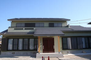外壁をグラストウォール吹付(見た目に優しい若草色)、平板形状イブシ黒瓦を採用した新和風住宅です。