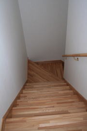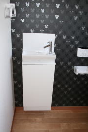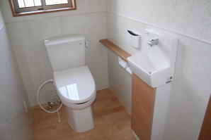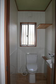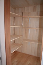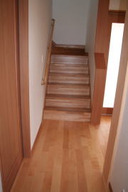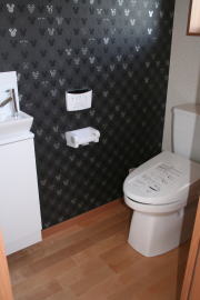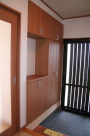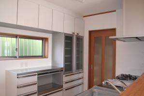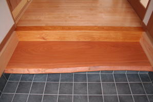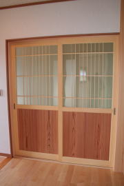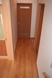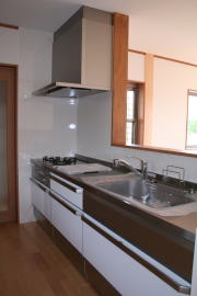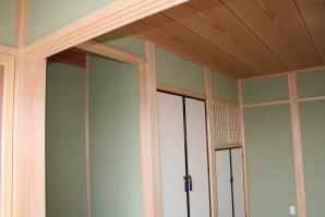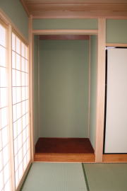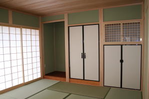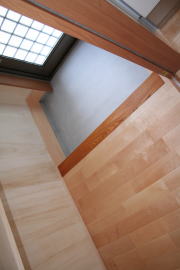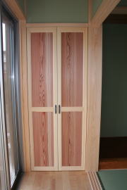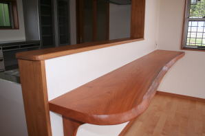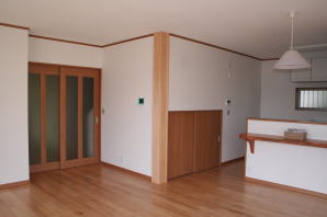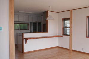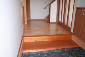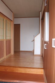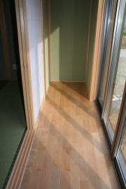 | 内装概要 | 廊下の巾・階段の巾を1m以上として「日々の生活動線によるストレス」を軽減した間取りの家、1階・2階ともに床仕上材にムク(天然木)カバ桜フローリングを採用しています。 ホール中央に階段の登り口がある間取りになっており、LDKと居室(畳敷きの洋室)から階段下のデッドスペースを活かして使えるようになっています。 LDK(19.5帖)はシステムキッチン横から食品庫(兼勝手口)につながっており、キッチン前に独特の杢目の天然木カウンターを組み付けました。 和室まわりは縁側・床の間・仏間・神棚・押入という定番の和風の間取りながら、上質な縁を使った畳・杉銘木の目透し天井の「すっきりとした和風の客間」として使える和室です。 2階にはトイレだけではなくホール部分に洗面化粧台スペースを設けており、家族が増えても順番待ちせずに快適にお住いいただけます。 |