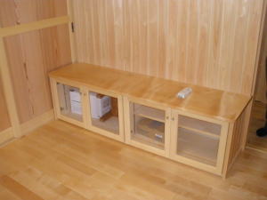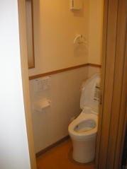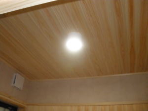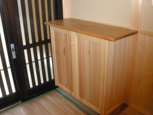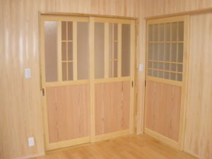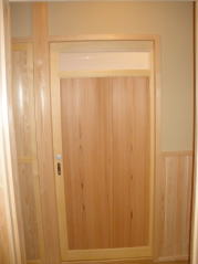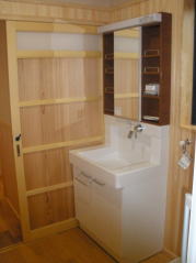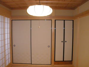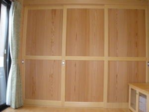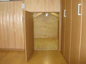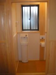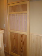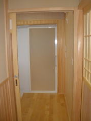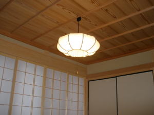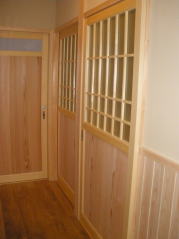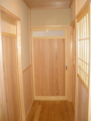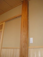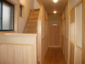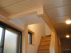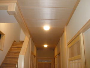 | 内装概要 | 真壁仕上(柱あらわし)、左官塗り仕上、桧無節板張りを多用した内装のお住いです。 地域条例による敷地の制約上、建物の短辺方向が巾5m以下というコンパクトな間取りになっていますが、廊下の巾は1m以上(柱中心〜柱中心)を確保して、日々の移動を快適にしています。 年配の方がお住いになる住宅なので、寝室として使う和室・居間・DKのシャッター雨戸は楽に開け閉めをおこなえる様に電動シャッター仕様としました。 和室は竿天(竿縁天井)・二重廻子・長押という伝統的な和室仕上、ケヤキ大黒柱18cm角が室内のアクセントになって重厚な雰囲気を醸し出しています。 2階の居室は桧無節板張りの壁仕上、桧特有のやさしい香りでぐっすり眠れる寝室になっており、収納力を上げる為に下屋(1階の屋根)空間を活かした小屋裏収納を設けました。 脳梗塞や心筋梗塞の原因となるヒートショック(急激な気温差による血管収縮)を防ぐため、浴室だけでなく洗面脱衣室にも暖房機器(壁掛け式)を設置しています。 |