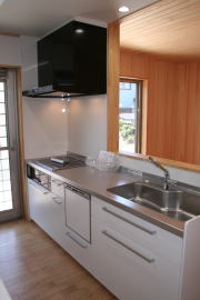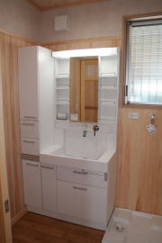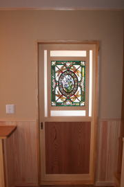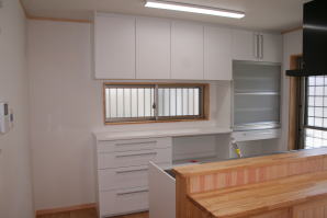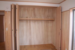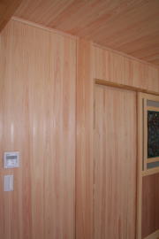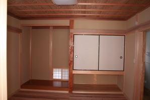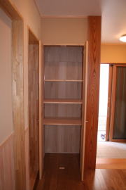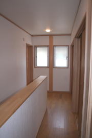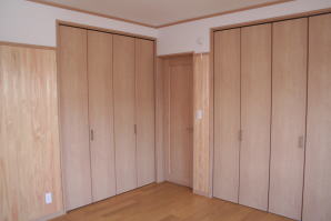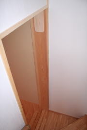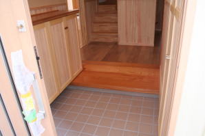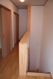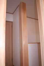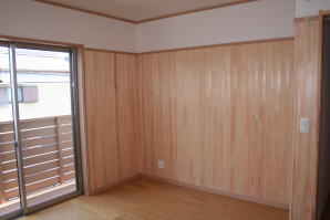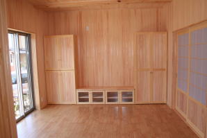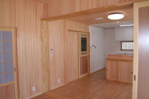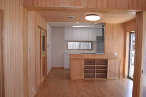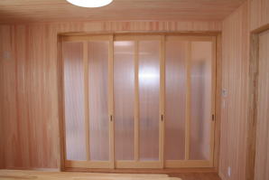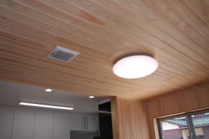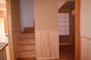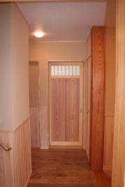 | 内装概要 | お施主様の生活動線を考慮して廊下等の移動空間を最適化し、コンパクトな間取りながら使い勝手や暮らし易さを追求したお住いとなっています。 このS様邸は、1階・2階ともに当社おなじみ東濃桧の無節板張り仕上を壁仕上や天井仕上に多用した内装仕様になっています。 1階ホール廊下と玄関には桧板張り腰壁(床から約1mまでの壁面)の上を大壁(柱の表面を室内に出さない壁)形状にて珪藻土塗り仕上をおこない、2階の居室については桧板張り腰壁(床から約2mまでの壁面)の上を壁紙クロス貼り仕上としました。 玄関を入って左側、ダイニングの入口は特殊なステンドグラスを組み込んだ引戸になっており、他の1階部分の建具も全て職人による創作建具(既製品ではない、オーダー建具)です。 ダイニング(6帖)の天井は東濃桧の無節板張り仕上、リビング(8帖)の天井は梁あらわしとして梁間には同じ東濃桧の無節板を張って天井仕上としました。 このダイニングとリビングは壁仕上についても全て東濃桧の無節板張り仕上となっており、桧ならではの優しい香りに癒される快適な空間となっています。 |