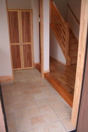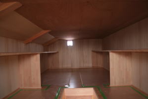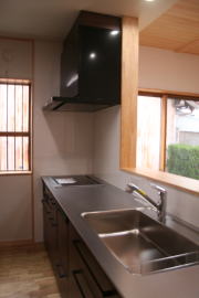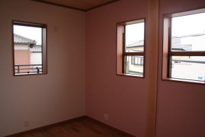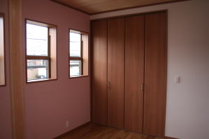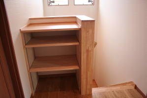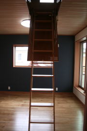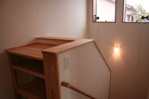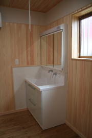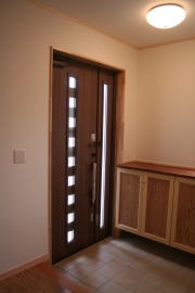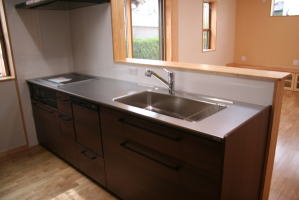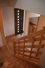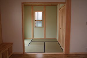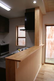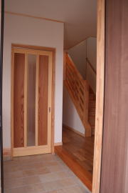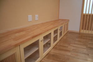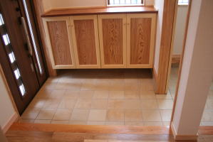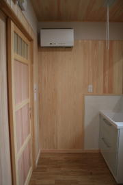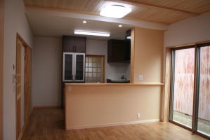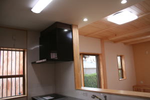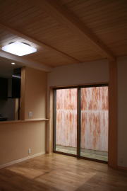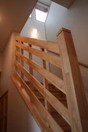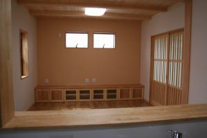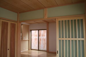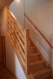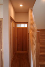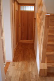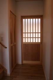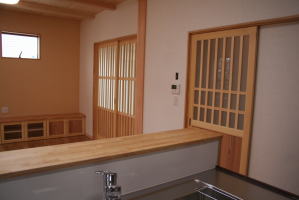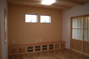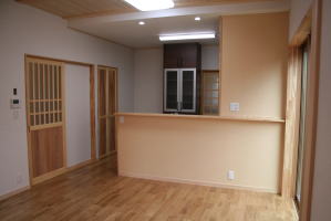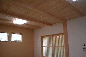 | 内装概要 | このK様邸は外皮断熱材(家の外周りの断熱素材)に「セルロースファイバー」を採用して、窓には高い断熱性能を持つアルミ複合樹脂サッシ「サーモスU」を施工しました。 UA値(外皮平均熱還流率〜外部から屋内への熱の伝わり易さ)が「0.6以下」になるよう断熱層の厚みを計算して設定しており、断熱材の「セルロースファイバー」が調湿機能を発揮するので木造の構造体(土台・柱・梁など)と相性が良く、家が「末永く頑強な状態」で長持ちします。 さらに大屋根(2階の片流れ屋根部分)に「6.6kw/hの太陽光発電システム」を設置したので、「ZEH(ゼロエネルギーハウス)基準」を満たした環境性能を持つお住いになっています。 片流れ屋根の中の大きなスペースを活かして造る小屋裏空間(約5.3坪)をはじめ、各所に使い勝手の良い収納スペースを設けて、お住いになるお施主様ご一家の利便性を高めました。 LDKの掃出し窓(巾1.8mで高2mの大きな窓)の前にはテラス屋根付ウッドデッキを造り付け、テラス屋根に物干し金具を設置して、使いやすい物干スペースを造っています。 |