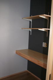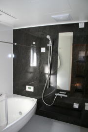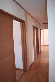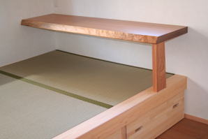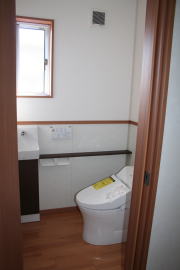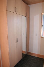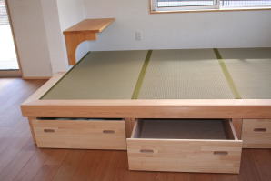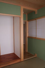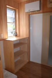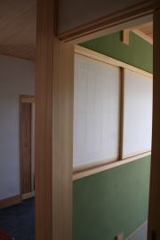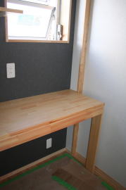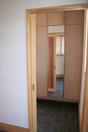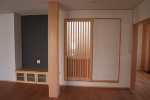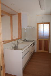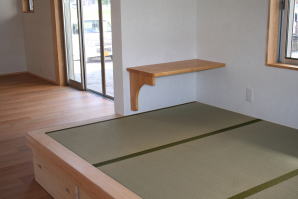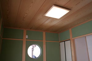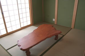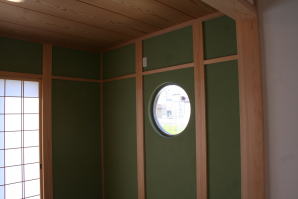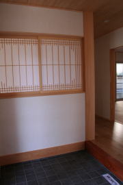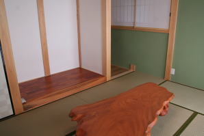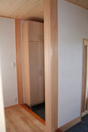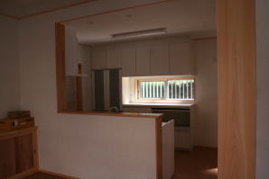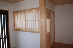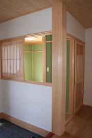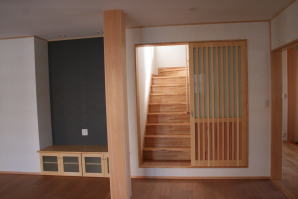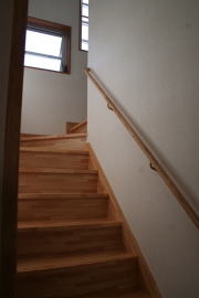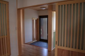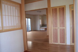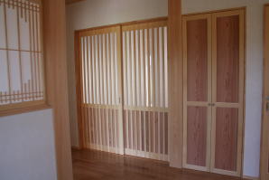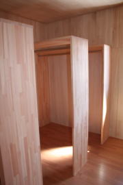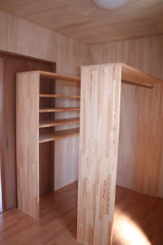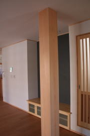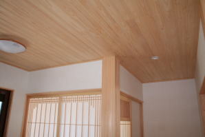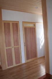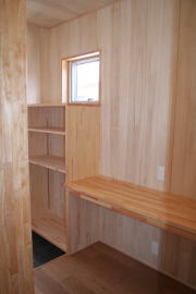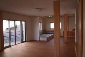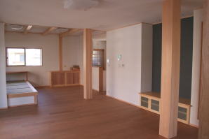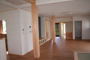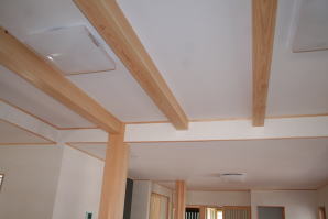 | 内装概要 | とても広い(30帖超)LDKを1階の間取りの中心に配置した洋風仕上のお住い、電熱パネル式の床暖房や広々システムバス(1.25坪タイプ)等の快適設備を持つ『オール電化住宅』です。 パントリー(家事室兼食品庫)や小屋裏収納(8帖間)といった収納スペースを各所に設けて「使い勝手」を良くしており、コンパクト(広さ1坪)ながら書斎を1階に造りました。 総桧(ひのき)造りの軸組(じくぐみ〜家の主要な骨組)は伝統的な造りとなっており、家の真ん中に大黒柱(東濃桧24cm角)と母大黒柱(東濃桧24cm角)を立てて、その上に中桁丸太(なかげたまるた〜屋根の長辺方向を貫く丸太)を組んで梁丸太(はりまるた〜屋根の短辺方向に貫く丸太)を載せています。 この小屋組の構造は「一本物で貫く部材が水平方向に何本もある」為、地震の横揺れの際に大きな抵抗力を発揮するので、大きな地震の時でも家の中は安全です。 |