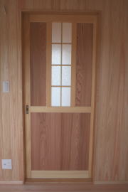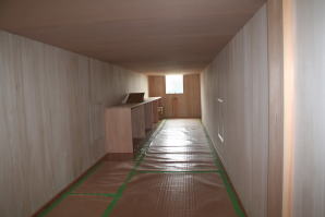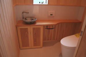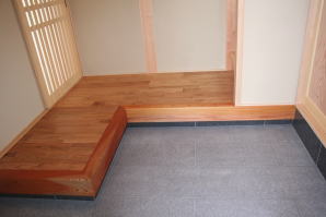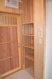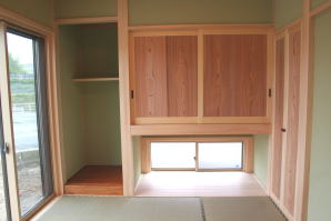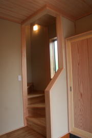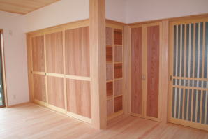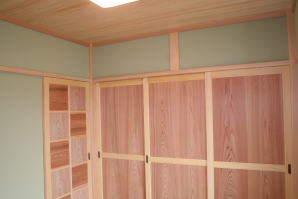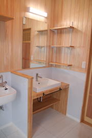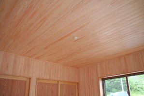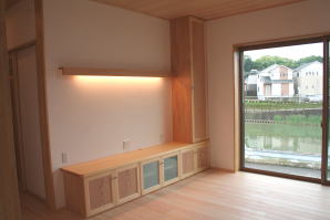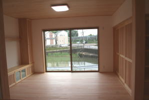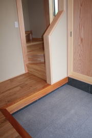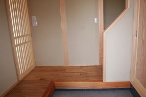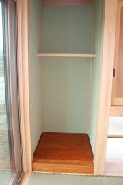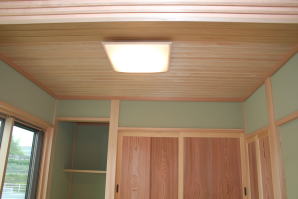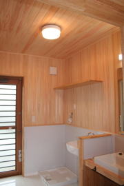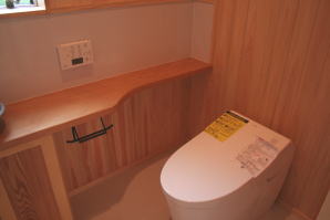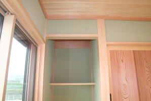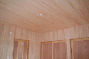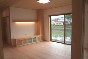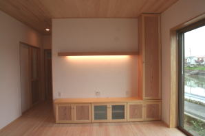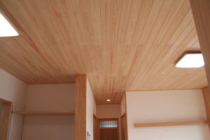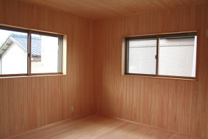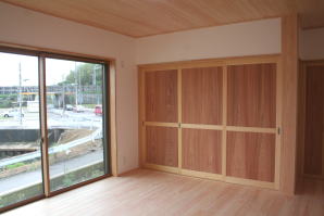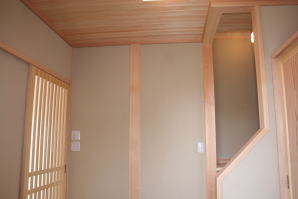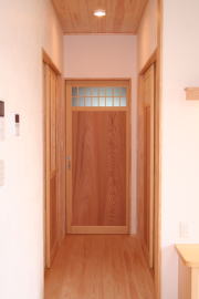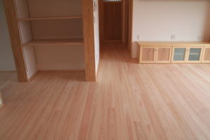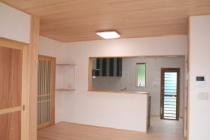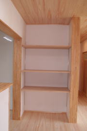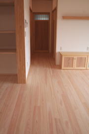 | 内装概要 | このY様邸は、高レベルの断熱性能(ZEH基準を大幅クリア)を持っているお住いです。 外皮断熱材(家の外周りの断熱素材)を「セルロースファイバー断熱仕様」として、窓には高い断熱性能を持つアルミ複合樹脂サッシ「サーモスU」を採用しました。 セルロースファイバー断熱は「細かく砕いた木繊維」を「床下地内」「壁内」「天井裏」に敷き詰める工法で、優れた断熱性能・防音効果を発揮することに加えて、「素材の持つ調湿効果」によって「木造住宅の構造材(土台・柱・梁桁)」を腐朽しにくく長持ちさせます。 アルミ複合樹脂サッシは、室内側のガラス周り枠が樹脂製なので熱が伝わりにくく、通常のアルミサッシより断熱性能に優れていて、冬季でも結露しにくいのが利点です。 玄関ホールから固定階段で入れる小屋裏収納(約6坪)、肌触りの良い自然素材仕上にこだわったリビングダイニング(床:桧(ヒノキ)無節材の縁板、壁:左官しっくい塗仕上、天井:桧の無節板張り仕上)他、住み心地と使い勝手を最優先に間取り・プランニングした平屋建てです。 |