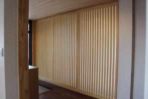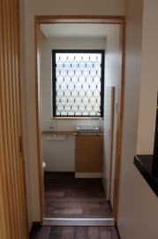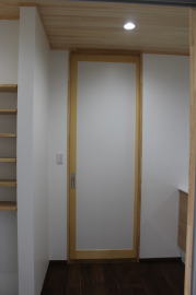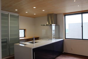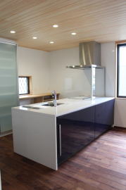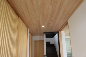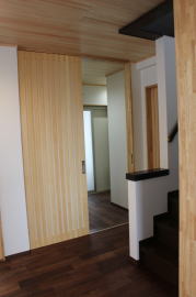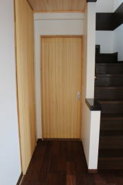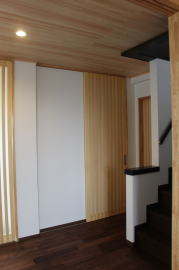 | 内装概要 | 築後およそ約20年くらい経過した「ハウスメーカー製の鉄骨住宅」の大改修です。 1階の既存の内壁と天井の解体をおこない、経年劣化して端部スキマが発生していた既存の断熱材を取り外し、高密度グラスウール断熱材(長期優良住宅仕様の家で使われる製品)を取り付けて気密処理を施して、新たに下地材を固定して内装仕上を造り直しました。 新設した天井は全て「桧(ヒノキ)無節の板張り仕上」となり、既存の床レベル調整をして段差を無くしてバリアフリー化をおこなった床面の仕上は高級木材「ウォールナット天然木フローリング」を採用しています。 廊下ホールと各部屋をつなぐ「高さ約2.4mの間仕切引戸」等の内装の建具には、建具職人による完全オーダーメード創作建具を取り付けました。 2階トイレを含む全ての住宅設備機器(システムキッチン、キッチン収納、システムバス、洗面化粧台、トイレ便器と手洗器)を新調して、水周り空間の全面リニューアルをおこないました。 なお、劣化が目立っていたバルコニー(2階と屋上)の床の防水槽と立上り部分には下地補修の後、表面のFRP再塗装を施工してます。 |