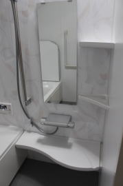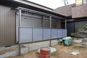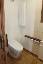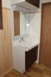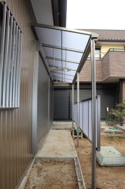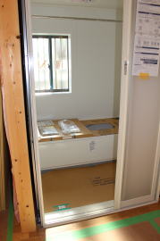 敷地裏手側の巾約2mの狭い道路に沿って「システムキッチン・浴室(システムバス)・洗面化粧台・トイレ等の水廻り設備一式」を備えた平屋建てを増築し、既存の母屋と渡り廊下で接続しました。