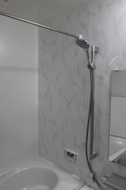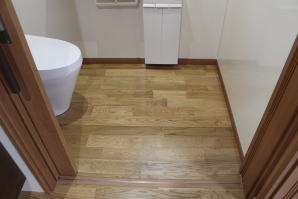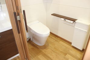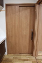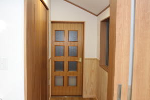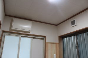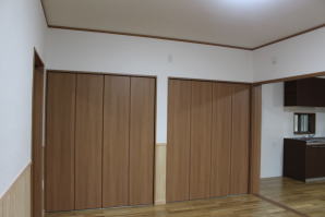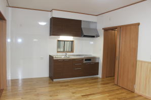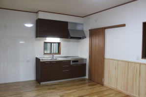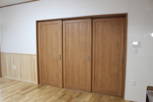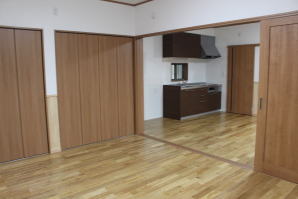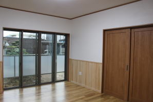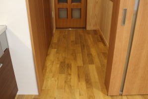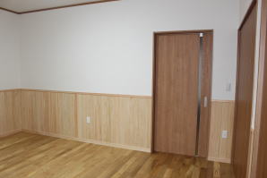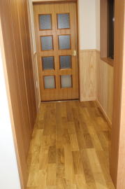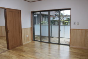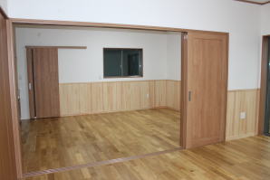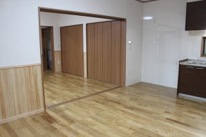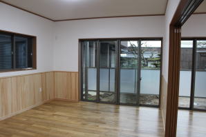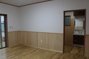 | 内装概要 | 既存の母屋に隣接して増築する「離れ」、水周り設備一式を備えた約16坪の平屋建てです。 「一列に並んだサニタリー、洗面脱衣室と浴室とトイレ」「洋室(居室10帖)とクローゼットx2ヶ所」「DK(ダイニングキッチン)12帖」「母屋との接続部:渡り廊下と収納」という間取りで、洋室とDKの前には電動シャッター付の掃き出し窓とルーフテラスを設けました。 外皮性能(断熱性能〜屋外から建物内への熱の伝わり易さ)については、長期優良住宅レベル以上のUA値(外皮平均熱還流率)約0.6で設計、外皮断熱材(屋外と建物内を隔てる境界に入れ込む断熱材)に高密度グラスウールを採用しています。 床仕上は全てナラ材ムク(天然木)フローリングで統一して一体感のある仕上がり、壁仕上には床から約1mの高さまでを「腰壁(こしかべ)」として桧(ヒノキ)無節板張りをおこない、その上部の壁面は左官しっくい塗を施工して「調湿機能・消臭機能」を持たせました。 |