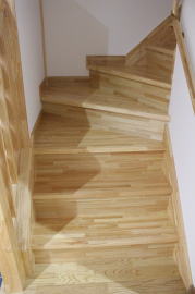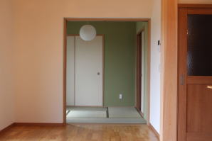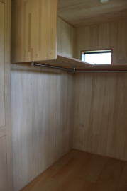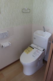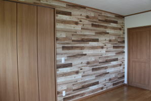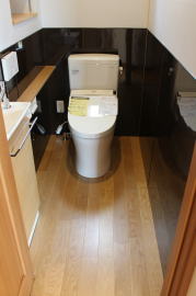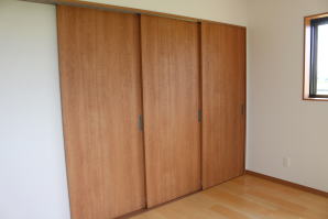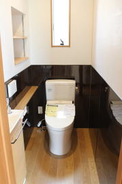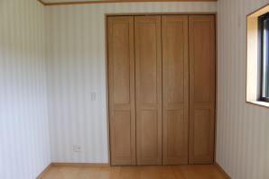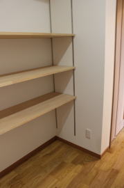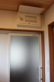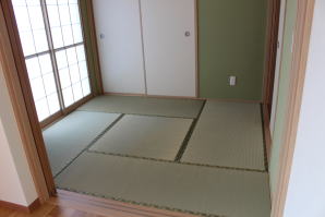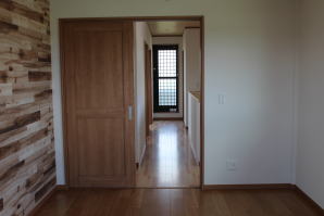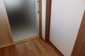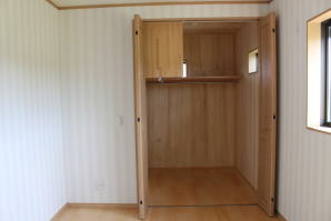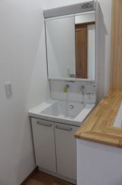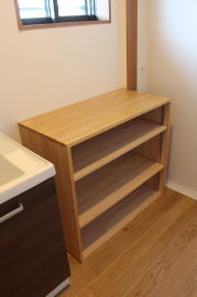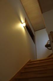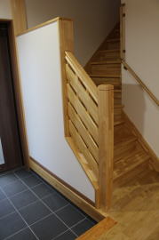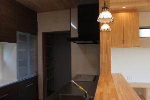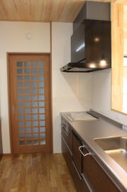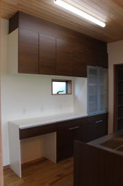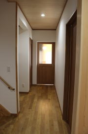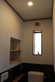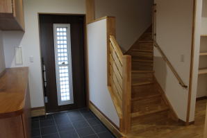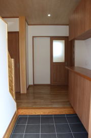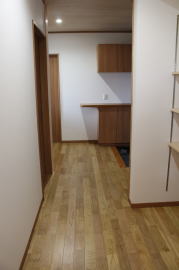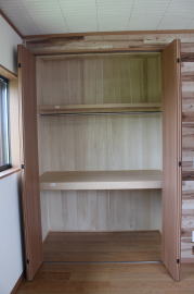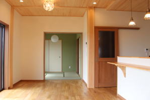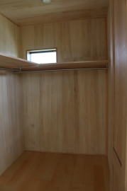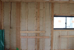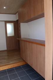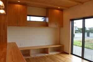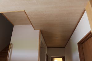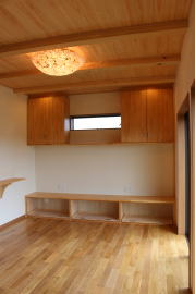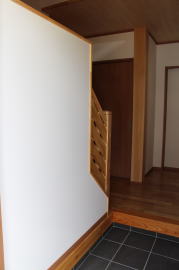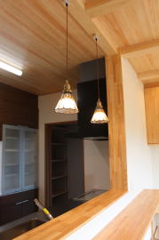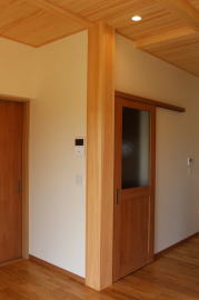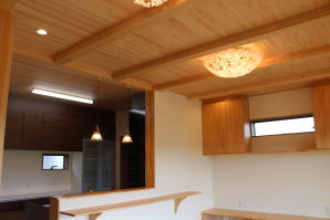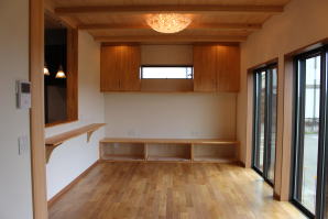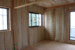 | 内装概要 | 1階の半分近くを占めるLDKのLD部分は、桧(ヒノキ)梁あらわし天井として天井高を2.7m超の広々だんらんスペースとしました。 東南に面した窓高2m巾1.6mの引違い窓を2箇所もうけた「光あふれる明るいLD」となっており、隣にある「掘座卓(掘コタツ)付の和室」とつなげて大きな一部屋として使う事ができます。 洗面脱衣室とは別に設けた「独立タイプの洗濯室」から物干しデッキへ出入りでき、このデッキの上部にはバルコニーがあるので雨天でも洗濯物が濡れる事はありません。 内装については自然素材をふんだんに、床に「ムク(天然木)銘木フローリング」、壁には「しっくい系ハイブリッド塗材の大壁塗り仕上」、天井に「東濃桧(ひのき)無節板張り天井」等を多く使った仕上りとなりました。 UA値(外皮平均熱還流率〜外部から屋内への熱の伝わり易さ)が「0.56以下」になるよう断熱層の素材と厚みを設定しており、壁内など空間に余裕が無い部位には「調湿機能を発揮する羊毛断熱材ウールブレス(一番下の写真、柱と柱の間の「白い綿」状の材)」を採用しています。 調湿機能を持つ断熱材は、湿気が原因の腐朽から「木造の構造体(土台・柱・梁など)」を守ってくれるので、パッシブ(「アクティブ=積極的」の反対語、電気等エネルギーを使わない状態)にて家を「末永く頑強な状態」で保つ事ができます。 |