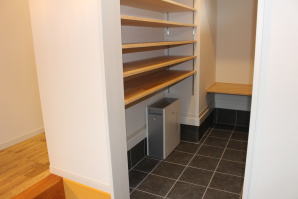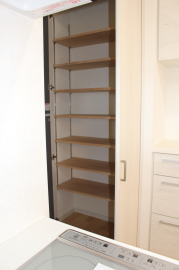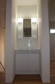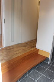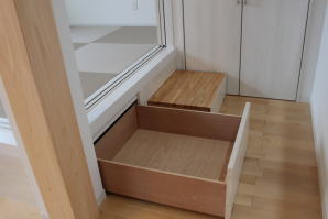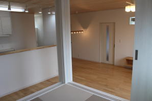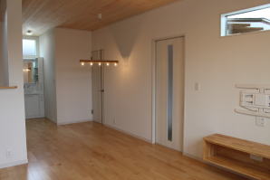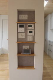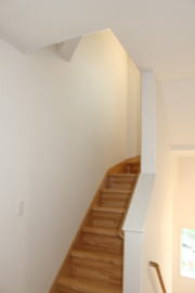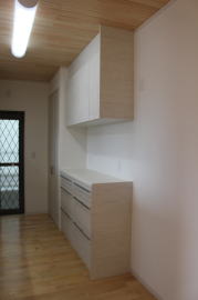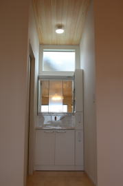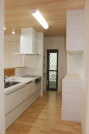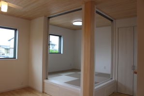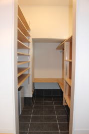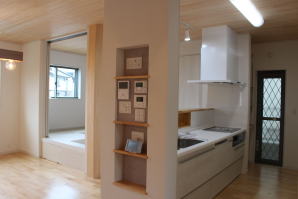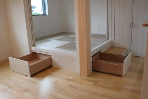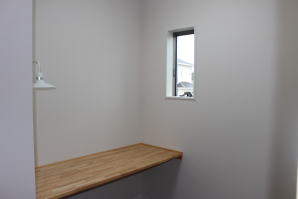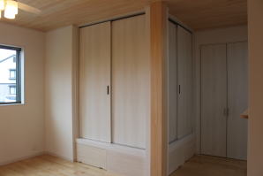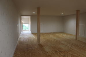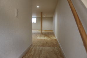 | 内装概要 | 2階の固定階段から出入りする広い小屋裏収納(約13帖)を設けた洋風住宅、「耐震等級3の長期優良住宅」かつ「蓄電池付ZEH(ゼロエネルギーハウス)」という高性能なお住いです。 外壁周りの壁内には木造の構造体(柱や梁などの家の骨組)と相性の良い「調湿機能を持つ羊毛断熱材ウールブレス」を使って壁内で結露するのを防ぎ、UA値(外皮平均熱還流率〜外部から屋内への熱の伝わり易さ)を「0.48(強化ZEHレベル以上)」に設計しました。 「ムク(天然木)銘木フローリング」等の自然素材の内装仕上を多く採用し、階段下スペースまで活かしきったシューズクローゼット、LDKに隣接した小上り和室の下の収納、キッチン腰壁スパイスストッカーおよび側壁の多機能ニッチ等、お施主様のこだわり「使い勝手」を追求しました。 パウダールームと書斎を備えた主寝室にはロッカー型ウォークインクローゼット、物干スペースにはインナーバルコニー(上に屋根があって雨に濡れないバルコニー)を設けています。 なお、2階ホールは広めの多目的ルームになっており、後々は壁を起こして子供部屋にリフォームできる構造にしました。 |