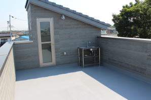 このお住いの最大の特徴はペントハウス(屋上階)から出入りする「広々とした屋上バルコニー(約12帖)」、屋上バルコニー内に屋外用流し台を設けて「お庭の代わりのガーデンスペース」としても使える多目的お役立ち空間です。