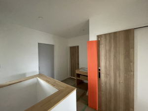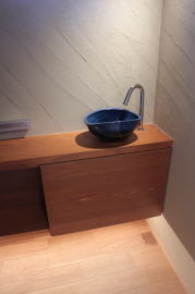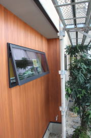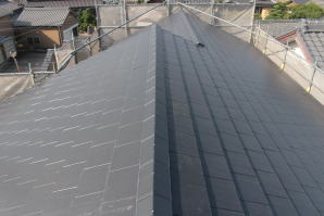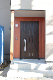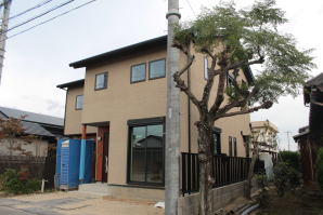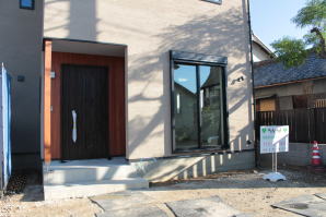 外観的な特徴としては、経年劣化によるメンテナンスがほぼ不要となる「平板(表面の凹凸を無くしたフラット形状)瓦ぶき屋根」、外壁面の仕上はアイカ製の左官塗り仕上材ジョリパットを施工する仕様、一部の外壁面にはアクセントとして天然木(ヒノキのムク)板張り仕上をおこないました。