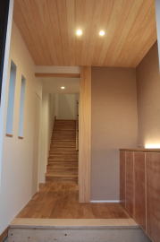 軒裏仕上 | ケイカル板張り(塗装仕上) 《 ポーチ天井は桧板張り 》 |