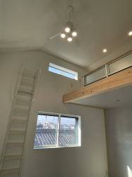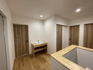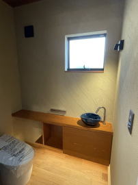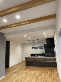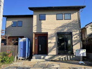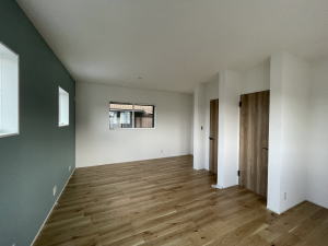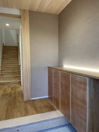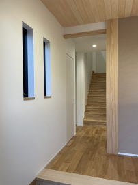 | 内装概要 | ZEH+(強化ゼロエネルギーハウス)基準クリアのUA値(外皮平均熱還流率〜屋外から屋内への熱の伝わりやすさ)0.48の高断熱省エネ住宅です。 「外壁周りの壁の内部」と「下部が外気となる所の2階床(玄関ポーチ上部と2階オーバーハング部)」と「キッチン天井(バルコニー下部)」および「小屋裏空間が狭くなっている部分(2階ロフト周り)」の断熱材に「羊毛断熱材ウールブレス」を採用しています。 このウールブレスは羊毛が原料で「湿気を吸ったり吐いたりする調湿機能」があり、木造の構造体(柱や梁などの家の骨組)の腐朽原因となる壁体内結露を防ぐので、たとえ百年が経っても家の骨組みは健康のまま、末永く住み続ける事ができるお住いの実現に有効な自然素材の断熱材です。 LDKのリビング部は高天井(床〜天井が約2.7m)にアクセント化粧梁を設けて特別感を演出、防音マット等で他の部屋や外部に音を漏らさないよう配慮した音楽室、高天井(約3.6m)一部ロフトを設けた2階の主寝室に約5帖ウォークインクロゼット併設、雨天でも洗濯物が濡れないインナーバルコニー(上に屋根があるバルコニー)には2階ホールと主寝室どちらからでも出入りできます。 なお、1階には防音設備を施した音楽室、2階には納戸と称したご主人の書斎スペースを設けており、ご夫婦それぞれの趣味の為の部屋を確保した「快適こだわり間取りのお住い」です。 |